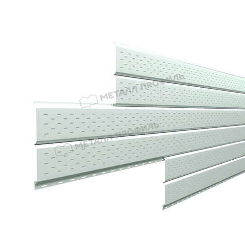 Софит — это специальные панели из серии Lбрус, оснащённые перфорацией на лицевой стороне. Они предназначены для подшивки карнизных свесов кровли. Благодаря аккуратному внешнему виду софит придаёт зданию завершённость и эстетическую целостность. Перфорированные отверстия обеспечивают вентиляцию подкровельного пространства, предотвращая скопление конденсата, а также развитие плесени и грибка.